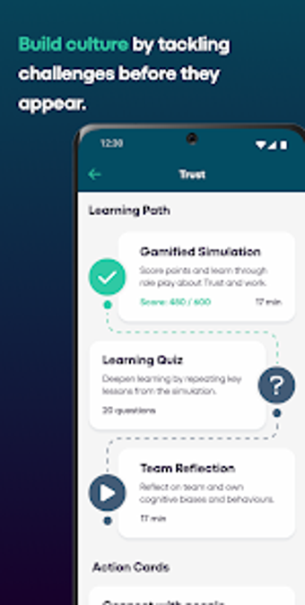 Cultiv8 (Snapshot) มี เกมสวมบทบาท และ การ์ดแอคชั่นดิจิทัล ที่เน้นการทำงานร่วมกันอย่างมีประสิทธิภาพ เข้าร่วมห้องดิจิทัล เพื่อพูดคุยเกี่ยวกับสิ่งที่คุณได้เรียนรู้จากการจำลองและ แบ่งปันประสบการณ์ของคุณ ผู้บริหารยังได้รับ แดชบอร์ดที่มีประโยชน์ เพื่อดูว่าทุกคนมีส่วนร่วมมากน้อยเพียงใดและวัฒนธรรมของบริษัทกำลังพัฒนาอย่างไร